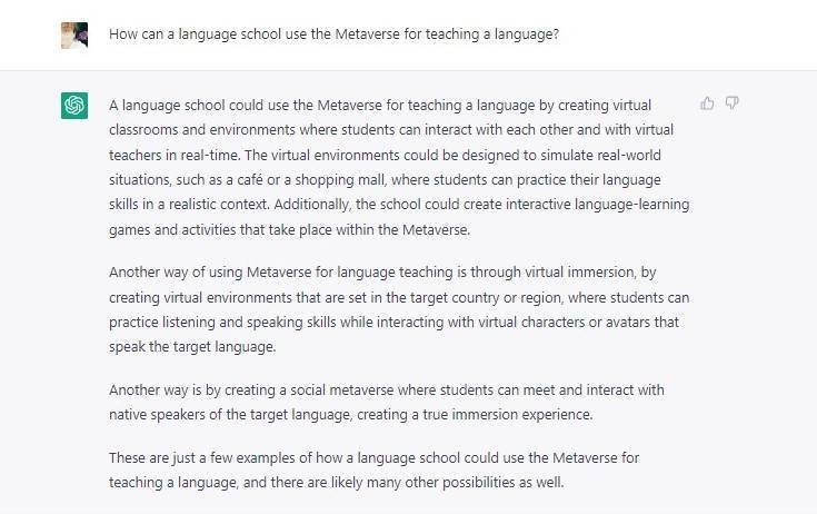 I asked ChatGPT how a language school can use the Metaverse for teaching a language. Here’s the answer:
