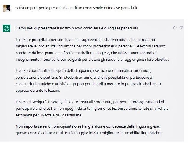 I prompted it with “Scrivi un post per la presentazione di un corso serale di inglese per adult” (Write a post to present an evening English language course for adults)